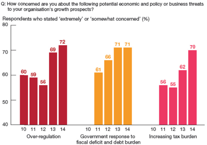 On constate cette année un niveau de préoccupation inégalé vis-à-vis de l’excès de réglementation, de la réponse des pouvoirs publics face aux déficits budgétaires et à la dette, et enfin des politiques fiscales.