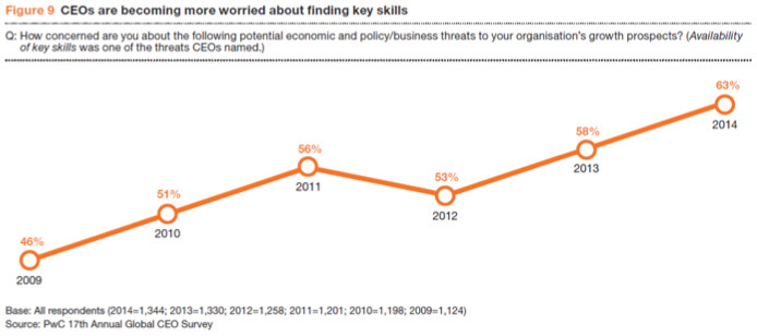 Par ailleurs, les dirigeants se déclarent tout aussi préoccupés par un ralentissement dans les économies émergentes (65 %) que par une croissance atone dans les marchés développés (71 %). Les autres préoccupations majeures sont les suivantes : alourdissement de la fiscalité (70 %), pénurie des talents (63 %), volatilité des taux de change (60 %) et instabilité sur les marchés financiers (59 %).