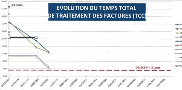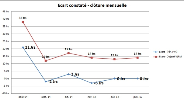 La remise de la clôture mensuelle est passée de 38 jours en Août 2014 à 14 jours en janvier 2015. Nous sommes encore à 14 jours de l’objectif.