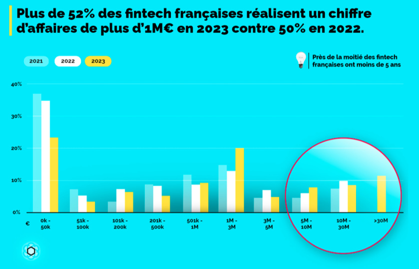 Mais est-ce une réelle catastrophe ou plutôt un signe de maturité ? Car, dans le même temps, nos fintechs semblent avoir maintenu une certaine activité. 52 % des fintechs françaises réalisent un chiffre d’affaires de plus de 1 Million d’euros en 2023 contre 50 % en 2022. Et ce, alors que la moitié d’entre elles a moins de 5 ans.