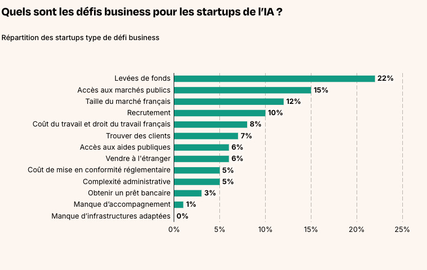 L’accès à la puissance de calcul est également un défi pour les startups françaises (11%), de même que le recrutement (13%), problèmes historiques toujours non résolus, mais pour lesquels les startups françaises se disent en meilleure posture que leurs homologues européens.