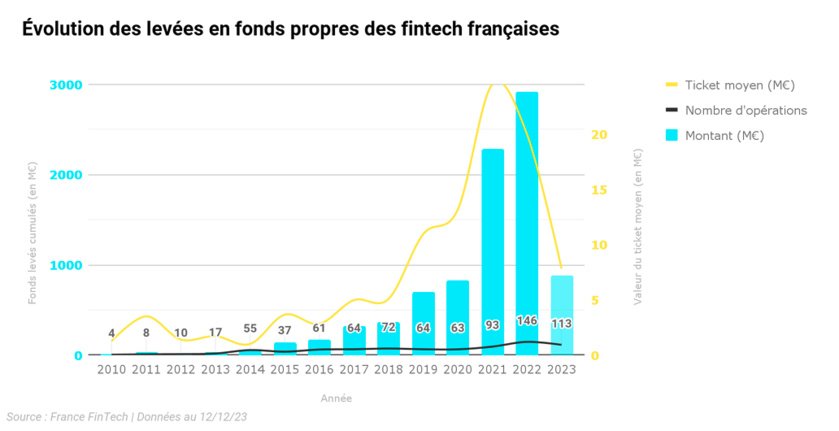 Etude | Les fintechs françaises ont levé 919M€ en 2023, un niveau en baisse de 70 % par rapport à 2022 mais équivalent à 2020