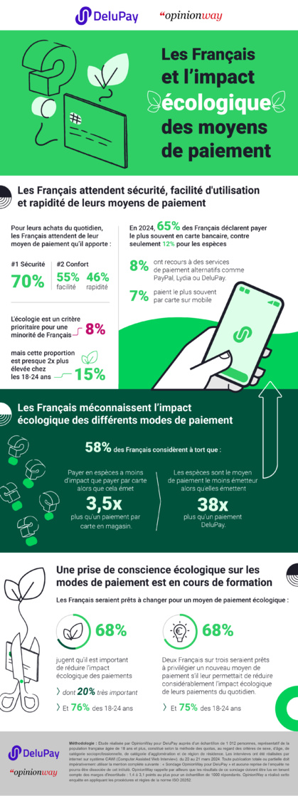 Donc, selon un sondage OpinionWay pour DeluPay réalisé sur un échantillon représentatif de la population française de 18 ans et plus (1012 personnes) entre le 20 et le 21 mars 2024, ce que recherchent avant tout les Français lors de leur paiement au quotidien, c’est la sécurité (70 %), la facilité (55%) et la rapidité (46 %)…. L’impact écologique n’étant important que pour 8 % de la population.