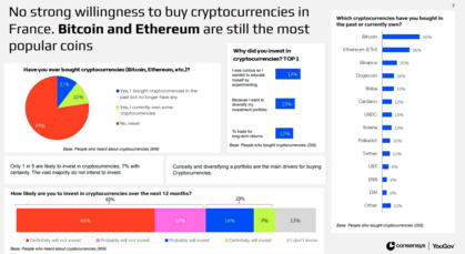 En tête des crypto les plus populaires et sans surprise, on retrouve le Bitcoin et l’Ethereum avec 23 % des Français qui affirment avoir déjà possédé ou posséder actuellement des crypto-actifs . Leurs motivations ? La curiosité et la volonté de diversifier leur portefeuille d’investissement.