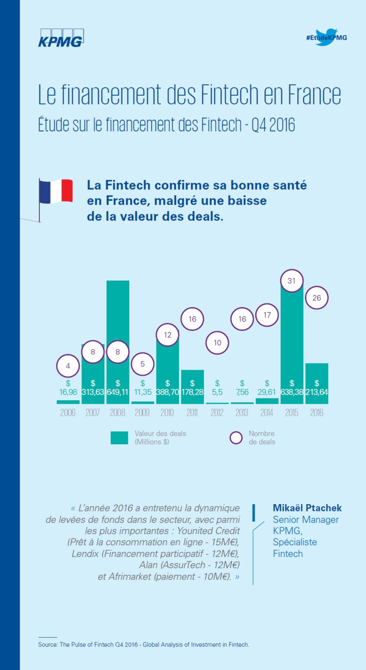 – 2010-2016 : Après 6 ans de croissance continue, chute des investissements et baisse du nombre de deals dans la Fintech en 2016 : baisse de 14 % du nombre de deals / baisse de 47 % des investissements ;
