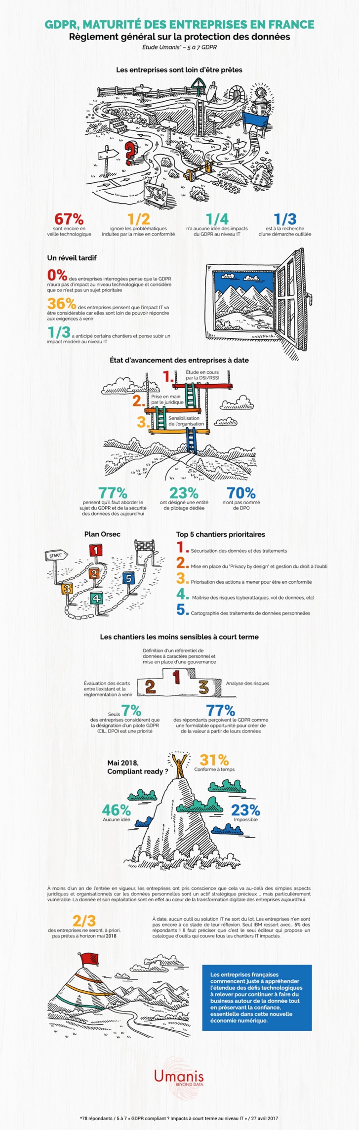 Les investissements IT représentent 2/3 du budget de mise en conformité au GDPR pour les entreprises. Depuis la promulgation de ce nouveau règlement, Umanis propose son expertise historique dans les chantiers data à mener : cartographie des données, inventaire des traitements et analyse des risques, sécurisation des données (datamasking, pseudonymisation et chiffrement), garantie de leur confidentialité, de leur l’intégrité ainsi que leur traçabilité (référentiel et gouvernance des données, data lineage).