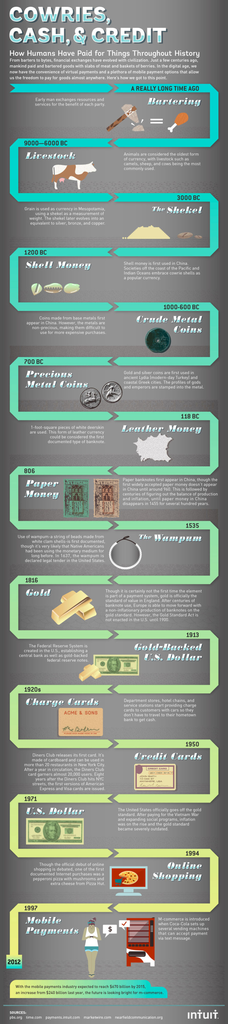 Voici un retour dans le passé avec cette infographie d’Intuit, dans laquelle vous découvrirez comment les gens ont payé pour des biens et des services à travers les âges.