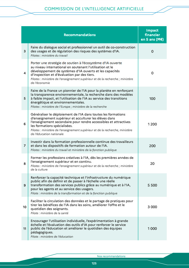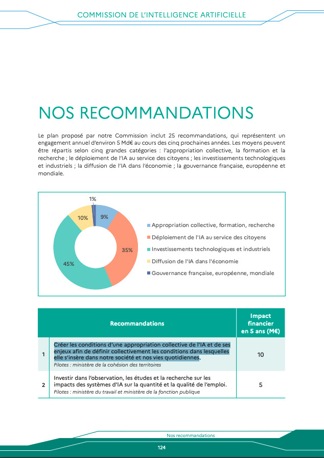 En fin de rapport, on trouve donc les 25 recommandations chiffrées représentant un engagement annuel d’environ 5 Md€ au cours des cinq prochaines années. Les moyens peuvent être répartis selon cinq grandes catégories : l’appropriation collective, la formation et la recherche ; le déploiement de l’IA au service des citoyens ; les investissements technologiques et industriels ; la diffusion de l’IA dans l’économie ; la gouvernance française, européenne et mondiale.