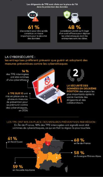 Et 14% des TPE interrogées ont déjà été victimes d’une cyberattaque. La sécurité des données se place en deuxième position des enjeux les plus importants (83%) après la santé mentale des dirigeants et des collaborateurs (92%). n 2024, 6 TPE sur 10 ont mis en place une ou plusieurs mesures de prévention pour se prémunir contre des cyberattaques, un chiffre stable par rapport à 2023 (58%) et qui avait connu l’année dernière une forte progression de 10 points.