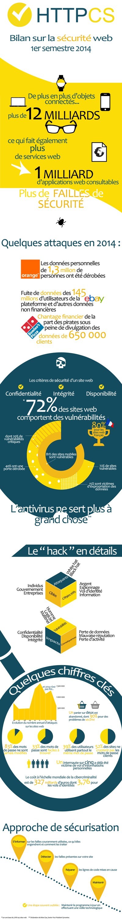 Les conséquences d’une protection défaillante face aux risques de piratage sont multiples et touchent tous les acteurs de l’écosystème, de la multinationale au particulier, impactant négativement l’économie. Outre le risque accru d’espionnage industriel, les entreprises doivent faire face à la méfiance des internautes de plus en plus exigeants sur la sécurité de leurs données. Sur les sites marchands, 1 panier sur 2 est abandonné, dont 30% pour des problèmes de sécurité. Ces mêmes internautes négligent pourtant les mesures de base de protection de leurs données puisqu’un tiers des mots de passe sont très faciles à deviner et 83% ne sont même jamais modifiés ! Résultat : 1 internaute sur 5 a déjà été victime d’un vol d’informations personnelles.