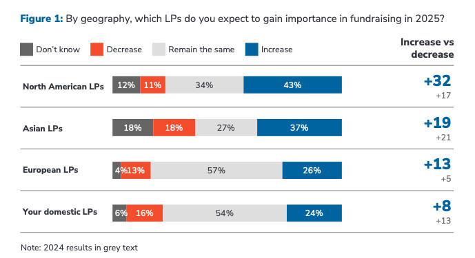A noter que lorsque l’on interroge les GP quant aux probables "origines " des LP’s qui pourraient prendre une importance accrue dans leur collecte en 2025, ils répondent, sans surprise, que les LP’s d’origine nord américaine devraient augmenter leur participation (43%). Cependant, petite surprise, puisque les investisseurs d’origine asiatique semblent se tailler une certaine importance dans les pronostics de nos GP.