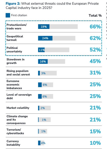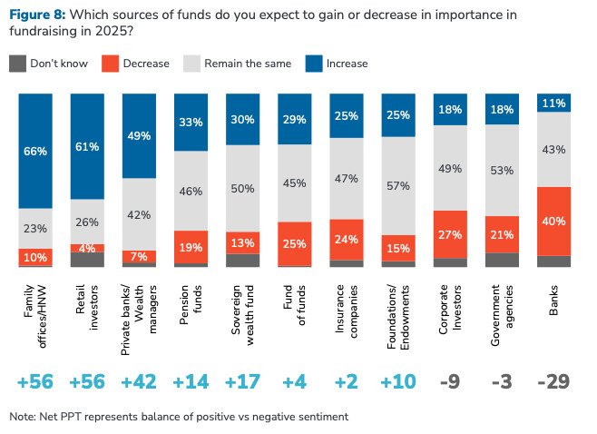 Par ailleurs, si on regarde la typologie des investisseurs que les GP’s attendent en 2025, ils sont 66 % à penser que les Family offices vont accroitre leur importance, suivis par les investisseurs individuels (61 %) et les CGP (+42 %).