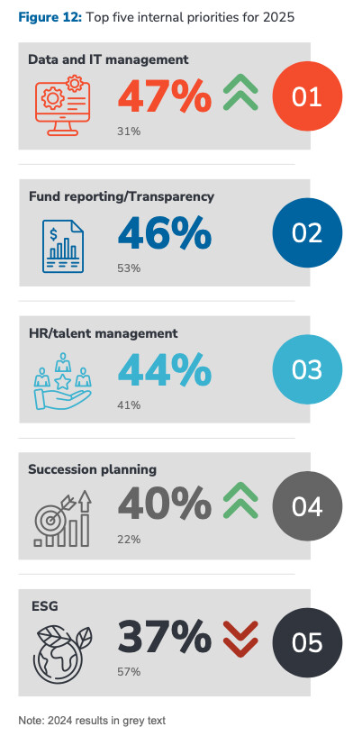A noter, qu’après les années qui ont vu de nombreux déploiements internes afin de répondre aux différents bilans ESG, cette préoccupation semble s’amoindrir, ils ne sont que 37 % à classer la partie ESG dans les préoccupations 2025 (contre 57 % en 2024).