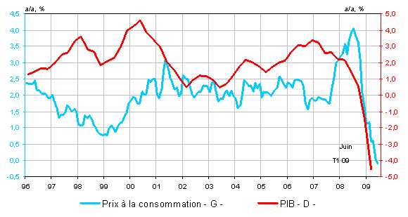 Bien entendu, cette déflation s’explique principalement par le repli des prix énergétiques de l’automne 2008 au printemps 2009 alors qu’un an plus tôt ces mêmes prix énergétiques flambaient. D’ailleurs, hors énergie et produits alimentaires, l’inflation dite sous jacente reste très faible à 1,6 % en mai et vraisemblablement 1,5 % en juin (les chiffres détaillés n’étant pas encore publiés).