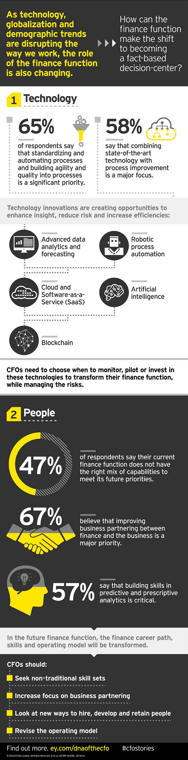 L’étude met en lumière les nouveaux défis de la fonction finance. En effet, avec l’arrivée des nouvelles technologies – comme le cloud, l’analytics, la mobilité, l’intelligence artificielle et la blockchain – la fonction finance doit se réinventer. De nombreux CFOs sont devenus les acteurs clefs de la transformation opérée par leurs organisations et doivent par conséquent tirer le meilleur de ce nouvel environnement technologique et réajuster leurs expertises.