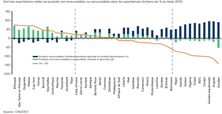 Ainsi, la région est globalement fragilisée par l’ampleur et le caractère durable de la chute actuelle des cours de matières premières. Les situations sont contrastées entre pays, selon qu’ils soient exportateurs nets de matières premières non-renouvelables (pétrole brut et métaux de base, en baisse vertigineuse) ou exportateurs nets de matières premières renouvelables (produits alimentaires et matières premières agricoles, dont le recul des prix est limité). Le score obtenu pour chacun des quarante-cinq pays étudiés (voir l’annexe) a permis d’identifier treize pays relativement peu affectés : l’Ethiopie, Sao Tomé, l’Ouganda, le Malawi, le Cap Vert, le Kenya, le Burundi, les Seychelles, le Centrafrique, l’Ile Maurice, la Tanzanie, le Swaziland et le Togo. La baisse de prix de leurs produits exportés est moins importante que celle de leurs produits importés.