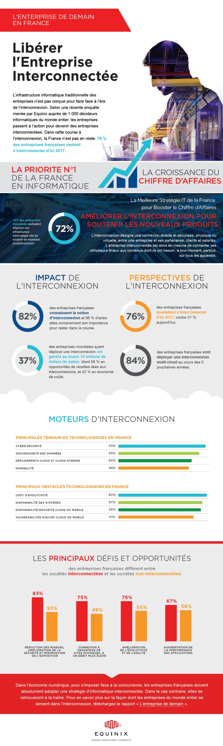 L’enquête Enterprise of the Future examine les priorités et les perspectives de plus de 1 000 décideurs informatiques dans 14 pays. Ses résultats révèlent une forte tendance à l’adoption par les entreprises de stratégies informatiques basées sur l’interconnexion afin de stimuler la croissance de leurs revenus. Ainsi, d’ici 2017, 84 % des décideurs informatiques interrogés déploieront une infrastructure axée sur l’interconnexion (la mise en œuvre de connexions directes et sécurisées, physiques ou virtuelles entre une société et ses partenaires, clients et employés), contre seulement 38 % aujourd’hui. L’enquête révèle également que cette approche peut générer une valeur de plusieurs millions de dollars. Le rapport complet « The Enterprise of the Future : Unleashing the Interconnected Enterprise » est disponible en téléchargement ci-dessous.