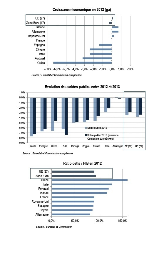Si l’on aime à opposer, de façon assez caricaturale il est vrai, les tenants de la relance à ceux de la rigueur, il se trouve que ces deux camps présentent une caractéristique commune ; un exercice 2012 désastreux du point de vue de la création de richesse. Quand les tenants de la relance sont entrés en récession économique, ceux de la rigueur affichaient des taux de croissance quasi nuls. C’est ainsi que le taux de croissance de la Grèce s’élevait à -6,4%, celui du Portugal à -3,2%, celui de l’Italie à -2,4%, celui de l’Espagne à -1,4% et enfin celui de Chypre, nouveau maillon faible de l’Union européenne, à -2,4%. Pour sa part, la France a fait une année blanche mais est, techniquement, en récession. En tête des tenants de la rigueur, le Royaume-Uni de David Cameron dont le taux de croissance a atteint non sans difficulté un timide 0,2% et l’Allemagne d’Angela Merkel qui affiche un taux de croissance de 0,7%.