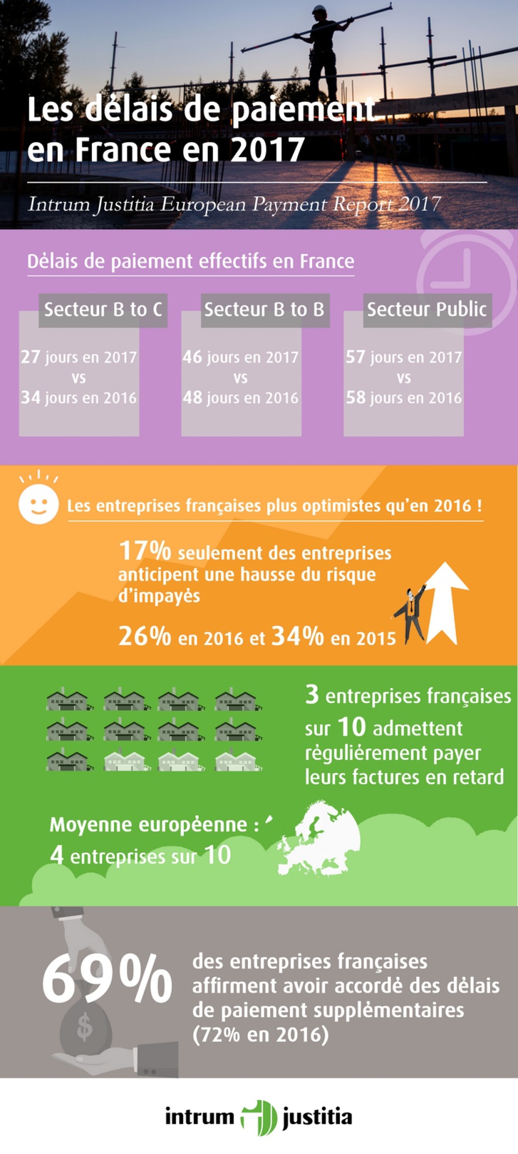 Pour Anne Williart, « l’étude réalisée par Intrum Justitia s’inscrit bien dans les tendances observées en France par les indicateurs économiques confirmant un regain de confiance des entreprises : des taux d’intêrêt faibles favorisant une reprise des investissements, une trésorerie améliorée des entreprises pour la première fois depuis 2005 et une baisse des défaillances d’entreprise. Dans ce contexte plus positif, les entreprises doivent encore améliorer leur délais de paiement pour contribuer à une économie plus saine.»