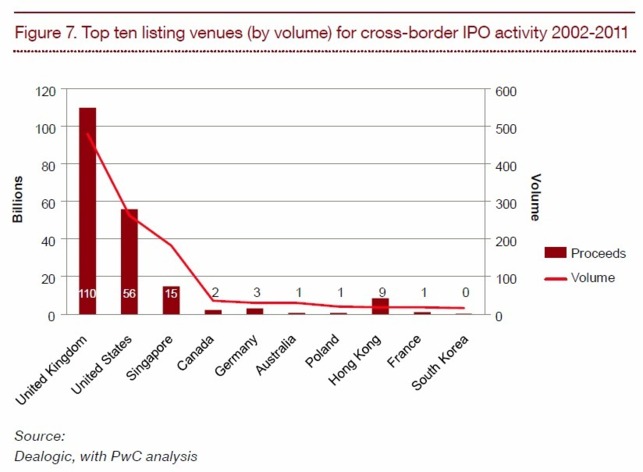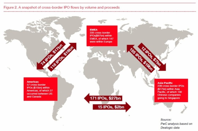 Philippe Kubisa, associé responsable des marchés financiers, PwC, déclare : « Certains constats nous ont surpris. La plupart des intervenants du marché connaissent le phénomène de l’introduction de sociétés chinoises aux États-Unis, mais beaucoup ne réalisent pas la forte activité des autres marchés comme Singapour et Francfort. Une autre surprise a été le nombre de sociétés américaines cotées à l’étranger, principalement à Londres sur l’AIM. »