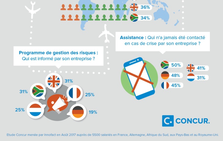 Selon l’étude, les voyageurs professionnels français interrogés (63,4%) savent qui contacter au sein de leur entreprise s’ils venaient à se trouver en danger dans le cadre de leur déplacement. Pour autant, comparativement aux autres pays de l’étude (Allemagne, Royaume-Uni, Pays-Bas, Afrique du Sud), c’est en France que les employés se montrent les moins confiants quant à la capacité de leur entreprise à leur porter assistance en cas de danger. Ils ne sont en effet que 48% à considérer que leur employeur pourrait leur venir en aide s’ils se trouvaient dans une situation risquée. C’est peu par rapport à l’Afrique du Sud ou au Royaume-Uni, où ils sont respectivement 66% et 63% à se montrer confiants.