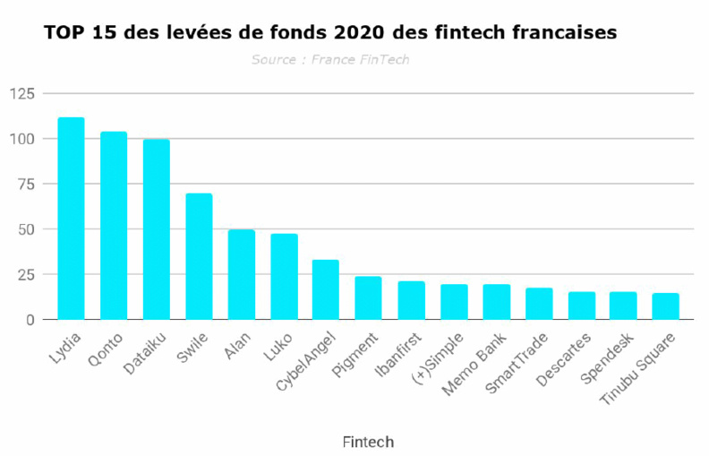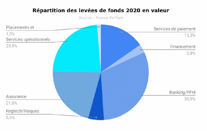 • Les services de paiement (15,3% des levées) et de néo-banque (31%) se renforcent, notamment grâce à une forte progression des usages numériques et une mise en œuvre effective de DSP2 (applications liées à l’open banking).