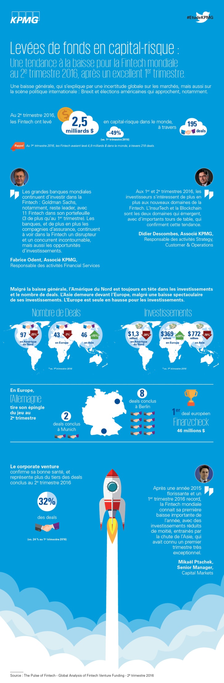 – Au 2ème trimestre 2016, les Fintech ont levé 2,5 Mrds $ en capital-risque dans le monde, à travers 195 deals, une baisse de 49 % par rapport au 1er trimestre 2016.