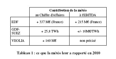 Trois entreprises, trois méthodes de communication, mais un même constat : la météo a un impact significatif sur le CA ou sur l’EBITDA, un impact quantifiable, en euros, qu’on peut dès lors interpréter comme la contribution des variations de change ou celle du prix des matières premières (voir Tableau 1 : ce que la météo leur a rapporté en 2010).