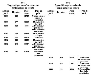Le « No Reg. de Commerce » n’est pas spécifié pour la première société et une recherche par le numéro B0042226 ne fait apparaître que la seconde société alors que dans les différentes publications la première société a le même numéro que la seconde société.