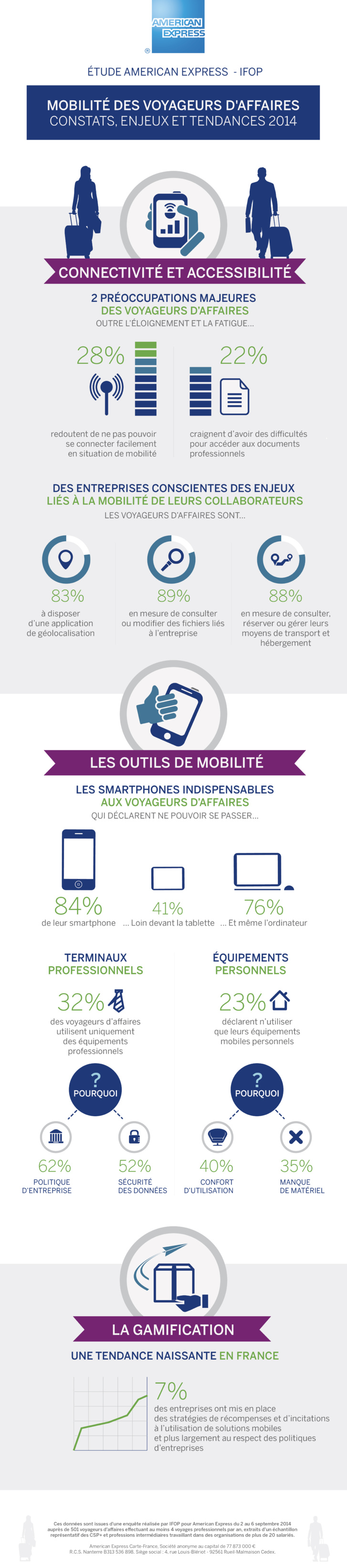 Cette enquête a été réalisée par l’institut IFOP pour le compte d’American Express Cartes Corporate auprès de 501 voyageurs d’affaires, issus d’un échantillon représentatif des CSP+ et professions intermédiaires travaillant dans des organisations de plus 20 salariés. La représentativité de l’échantillon a été assurée par la méthode des quotas (sexe, âge, profession, taille de l’entreprise) après stratification par région et catégorie d’agglomération. Les interviews ont été réalisées par questionnaire auto-administré en ligne du 2 au 6 septembre 2014.