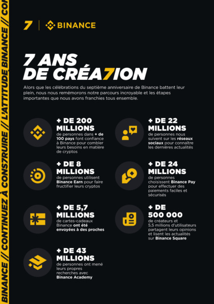 À l’âge de sept ans, nous possédons des caractéristiques de ces deux profils d’entreprise : la curiosité et l’agilité axées sur la croissance d’une jeune société, ainsi que la sagesse et la ténacité d’une organisation éprouvée qui a résisté à de nombreuses crises et beaucoup appris à la dure. Avec plus de 210 millions d’utilisateurs qui nous font confiance pour les accompagner dans leur aventure crypto, cette formule semble idéale pour stimuler l’élan mondial vers la liberté et l’inclusion financières. Voici où nous en sommes aujourd’hui. Par Richard Teng, PDG de Binance