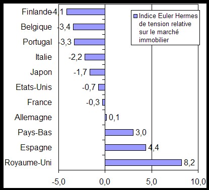 Euler Hermes a mis en place un indice synthétique de la tension relative sur le marché immobilier de chaque pays. L’indice le plus élevé est celui du Royaume-Uni avec 8,2 suivi par l’Espagne (4,4) et les Pays-Bas (3). La France a un indice de -0,3. Le pays dont la tension est la plus faible est la Finlande avec un indice de -4,1.