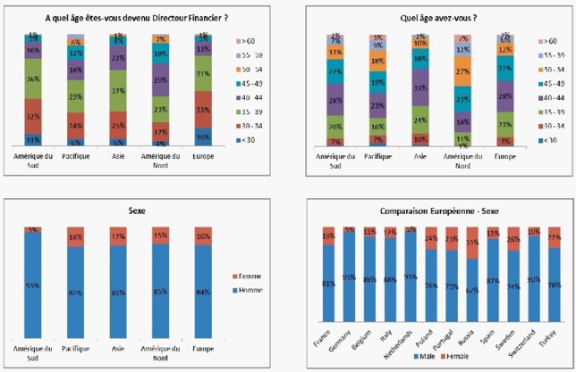 – Sur la parité homme-femme, les Russes sont les champions : 33% des CFO interrogés sont des femmes. Ils sont suivis par les Suédois, les Portugais, les Polonais et les Turcs (resp. 26%, 25%, 24% et 22% de femmes CFO). Les français n’arrivent qu’en 6ème position avec 19% de femmes CFO.