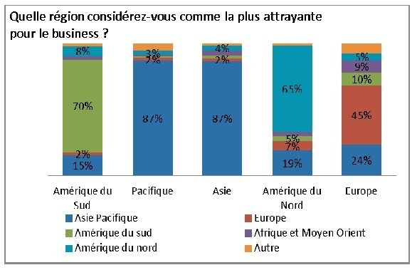 – Quel que soit son pays, le CFO désigne sa propre région, l’Asie Pacifique et parfois une région proche culturellement comme étant les zones les plus attractives pour son activité. Les CFO français désignent tout naturellement l’Europe (40%) suivie de l’Asie Pacifique (32%).