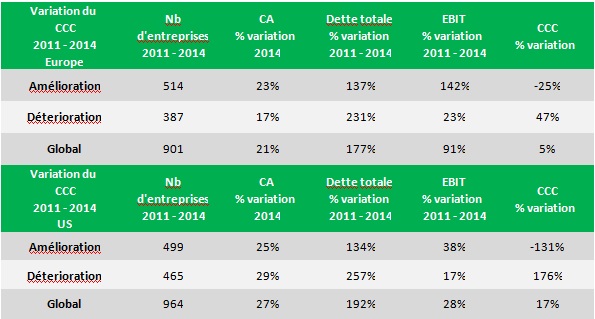 Dans l’édition 2015 de son enquête BFR annuelle , REL a analysé que les 514 entreprises qui ont amélioré leur Cash Conversion Cycle (CCC = Cycle BFR en jours) entre 2011 et 2014, sont celles qui ont accru leurs résultats de 24%, bien au dessus des 17% de croissance affichés par les 387 entreprises dont le CCC s’est détérioré.