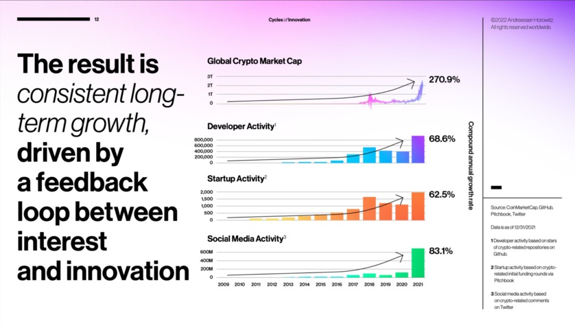 This report is the first of what will be an annual overview of trends in the crypto industry, shared through the a16z crypto vantage point of both tracking data and across the countless entrepreneurs and builders we meet. It’s for anyone who seeks to understand the evolution of the internet, and where we are on the journey towards a decentralized, community-owned-and-operated alternative to the centralized tech platforms of web2 – especially as it touches creators and other builders.