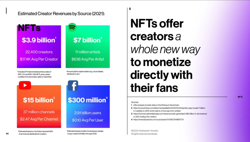 Our team conducted new data analysis to estimate how much web3 is paying out to creators compared to web2. (See slide 40 in the deck.) The numbers are telling even though it’s still early. In 2021, primary sales of Ethereum-based NFTs (ERC-721 and ERC-1155), plus the royalties paid to creators from secondary sales on OpenSea, yielded a total of $3.9 billion. That’s quadruple the $1 billion – less than 1% of revenues – that Meta has earmarked for creators through 2022.