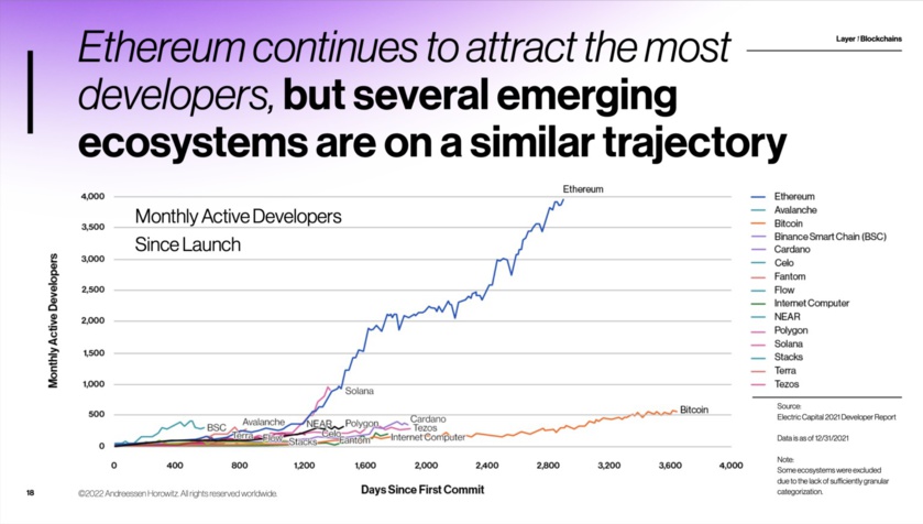 Ethereum’s lead has much to do with its early start, and, the health of its community. As far as developer interest, Ethereum has far and away the most builders, with nearly 4,000 monthly active developers. (See slide 18.) Following that is Solana (with nearly 1,000) and Bitcoin (about 500). Ethereum’s overwhelming mindshare helps explain why its users have been willing to pay more than $15 million in fees per day on average just to use the blockchain – remarkable for such a young project. (See slide 16.)