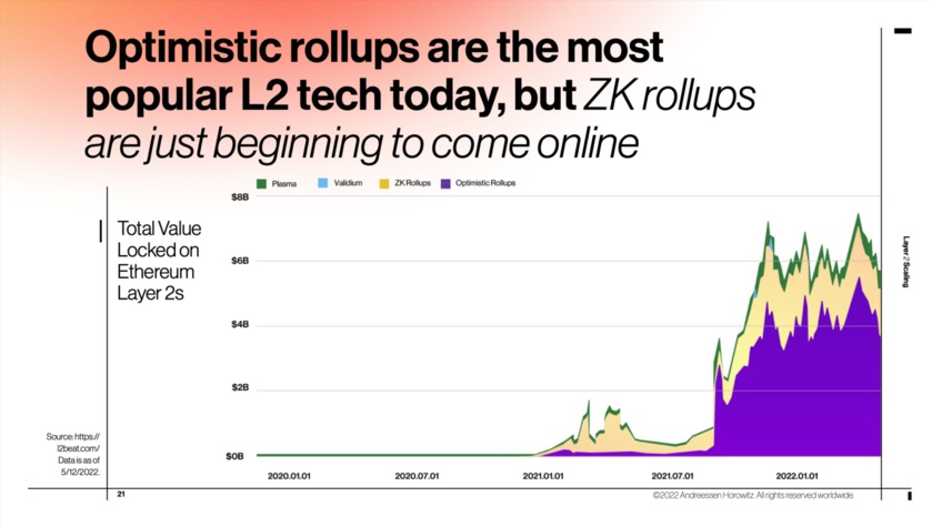Beyond challenger blockchains, we’re also seeing incredible progress with interoperability, which allows people to “bridge” assets from one blockchain to another, as well as “layer 2” technologies, such as optimistic rollups and zero-knowledge rollups, which aim to lower costs by expanding available blockspace. (See slides 17, and 21 through 23 in the deck.).
