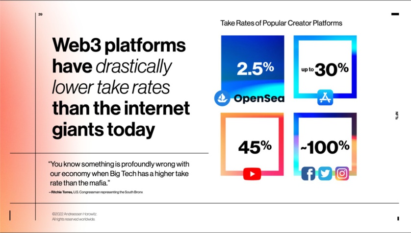 The take-rates of web2 giants are extortionate; web3 platforms offer fairer economic terms. (See slide 39 in the deck.) Compare Meta’s nearly 100% take-rates across Facebook and Instagram to NFT marketplace OpenSea’s 2.5%. As U.S. Congressman Ritchie Torres noted in a recent op-ed, “You know something is profoundly wrong with our economy when Big Tech has a higher take rate than the mafia.”