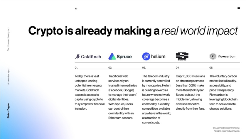 Crypto is addressing other broken marketplaces, too. (See slide 53 in the deck.) Flowcarbon is revamping carbon credits by making these increasingly important units of account transparent and traceable on blockchains. Helium, a grassroots wireless network, is posing the first legitimate, decentralized challenge to entrenched telecom giants. And Spruce is enabling people to control their own identities, rather than ceding that power to online intermediaries, like Google and Meta, who profit off people’s information through their data-mining business models.