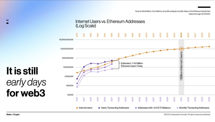 While it’s hard to know the exact number of web3 users, we can reason about the scale of the movement. We estimate there are somewhere between seven million and 50 million active Ethereum users today, based on various on-chain metrics. (See slide 54.) Analogizing to the early commercial internet, that puts us somewhere circa 1995 in terms of development. The internet reached 1 billion users by 2005 – incidentally, right around the time web2 started taking shape amid the founding of future giants such as Facebook and YouTube.