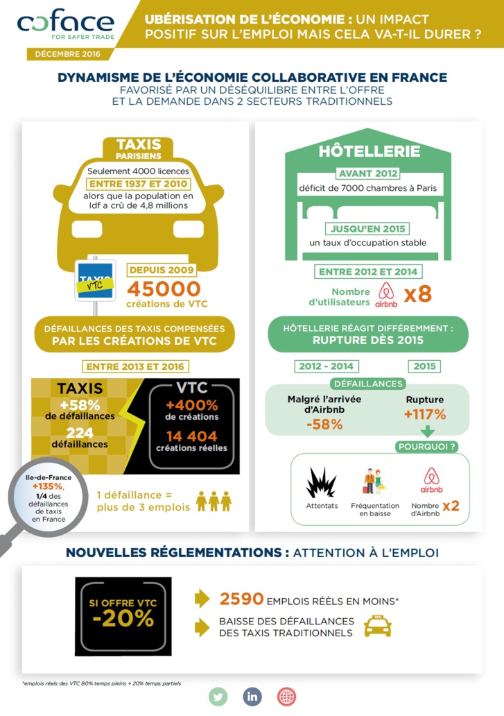 Les transactions réalisées dans le secteur devraient même être multipliées par 20 d’ici à 2025, et ainsi poursuivre leur tendance récente : entre 2012 et 2014, le nombre Par les économistes du Groupe Coface d’annonces Airbnb à Paris a été multiplié par 8. Et 14 000 sociétés de VTC ont été créées en France depuis 2010, cet essor résultant à la fois de motivations économiques des utilisateurs et entrepreneurs et/ou d’un déficit d’offre structurel.
