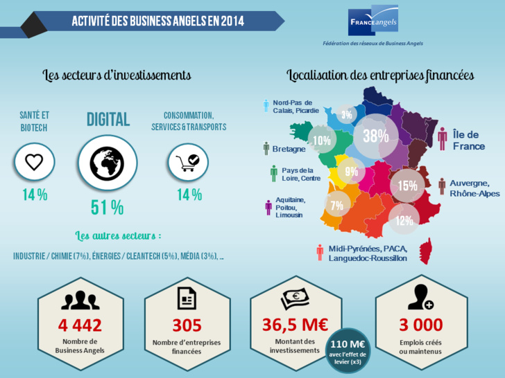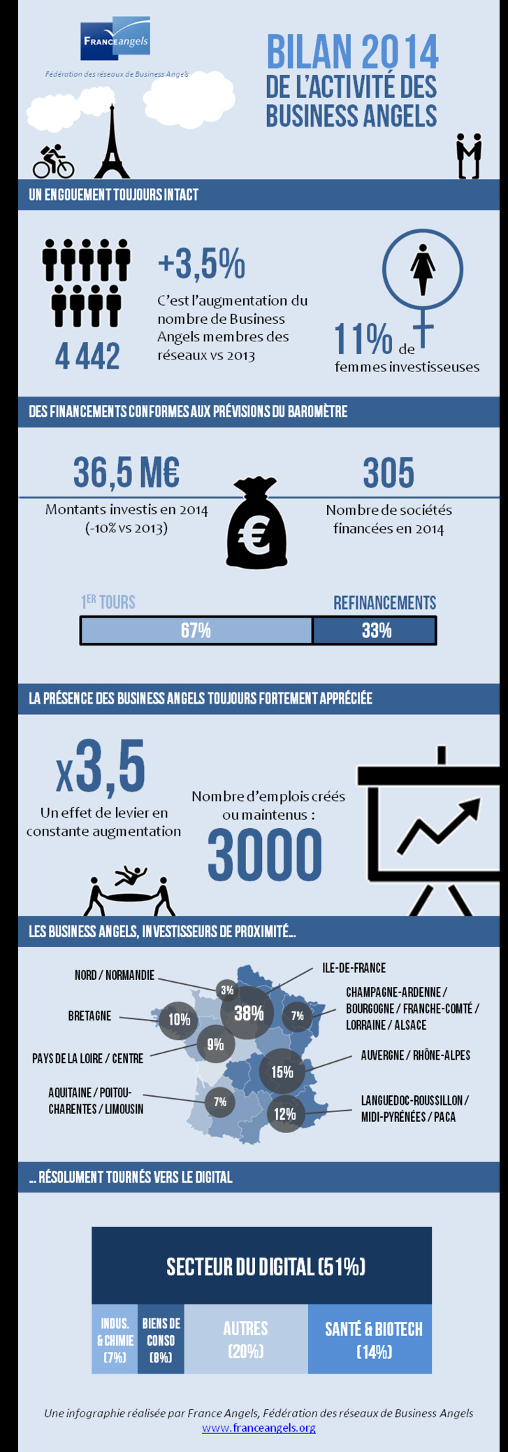 « En dépit d’une conjoncture économique difficile en 2014 et d’éléments propres aux investissements privés (contexte d’incertitude pour les investisseurs, fin de vie des Siba), les Business Angels issus des réseaux membres de France Angels ont consulté un nombre croissant de demandes d’investissements et ont maintenu une forte implication dans les tours de table des startups françaises, explique Tanguy de la Fouchardière, Vice-Président de France Angels. Les Business Angels renforcent ainsi année après année leur rôle de financeur de l’économie de proximité au service de l’innovation et sont aujourd’hui moteurs dans la création d’entreprise et d’emplois sur l’ensemble du territoire. »