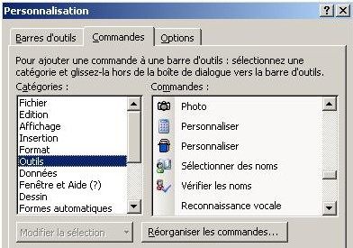 Sélectionnez alors l’onglet « Commandes », la catégorie « Outils », puis la commande « Personnaliser » avec une calculette à gauche (la seconde dans la partie droite de l’écran ci-dessous) :