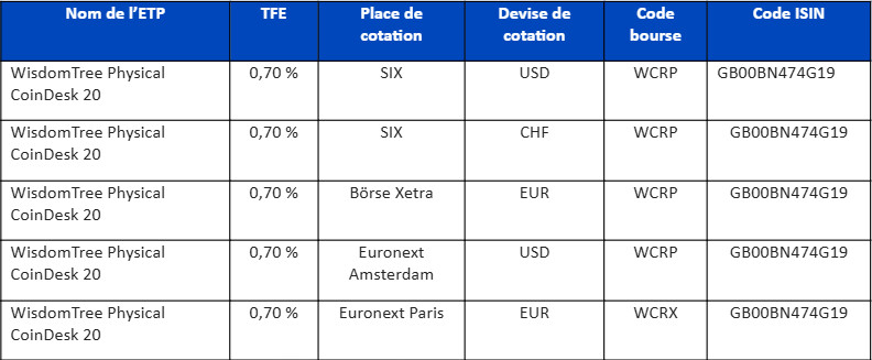 Coté sur Deutsche Börse Xetra, la Bourse suisse SIX ainsi que sur Euronext Paris et Amsterdam, le WisdomTree Physical CoinDesk 20 ETP (WCRP) permettra aux investisseurs de s’exposer à l’indice CoinDesk 20 de manière simple, sécurisée et efficiente. Cet ETP génère un revenu de staking proportionnel aux actifs immobilisés. Les actifs placés en staking participent aux mécanismes de consensus des blockchains concernées, ce qui contribue à leur sécurisation. Le produit WisdomTree Physical CoinDesk 20 est assorti d’un taux de frais sur encours (TFE) de 0,70 %, qui représente l’un des niveaux de frais les plus bas parmi les ETP de qualité institutionnelle investis dans des paniers de cryptomonnaies.