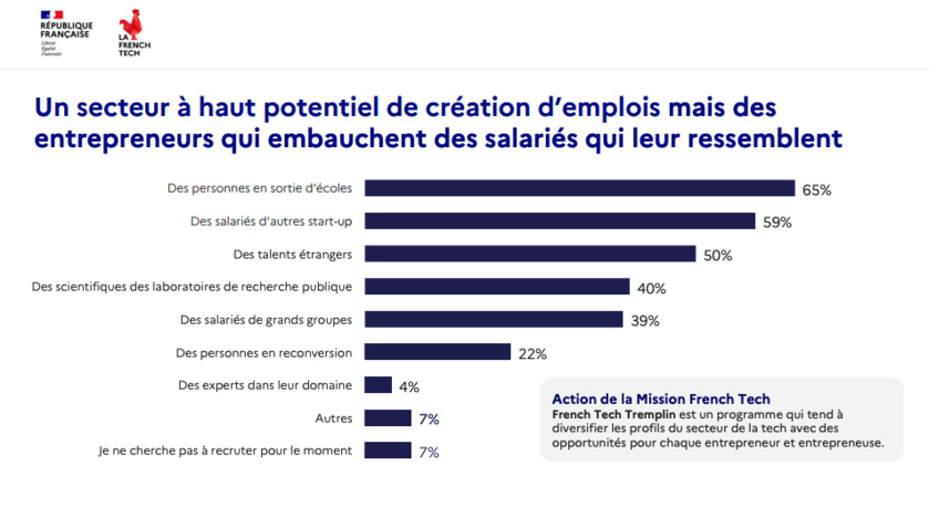 Un vivier pour l’emploi en France mais qui serait lui aussi soumis à une certaine "endogamie". Puisque juste derrière le profil "sortie d’école" se cache le critère "salariés d’une autre startup" (59 %). Mais bonne nouvelle : 85 % des dirigeants interrogés se sont fixés des objectifs à atteindre en matière de parité.