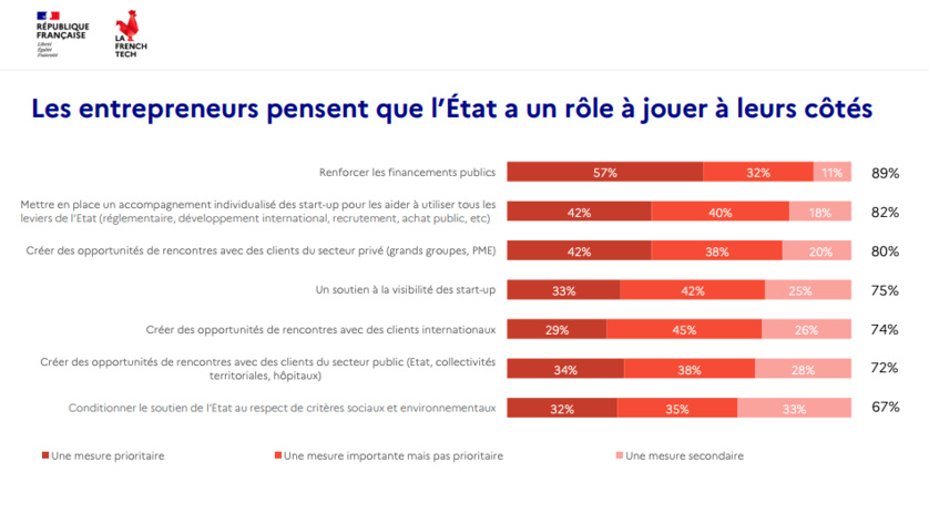 89% des entrepreneurs jugent prioritaire le renforcement des financements publics, la mise en place d’un accompagnement individualisé des start-up (82%), ou la création d’opportunités de rencontres avec des clients du secteur privé (80%).