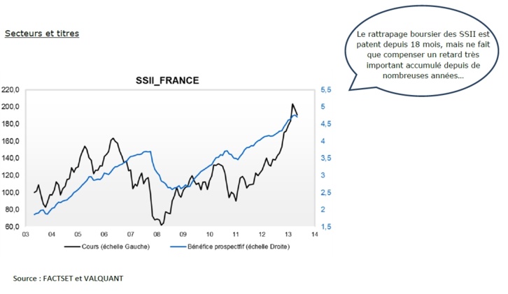 L’accent est porté ce mois-ci sur les SSII françaises, bien représentées sur la cote nationale. Le rattrapage boursier est impressionnant depuis 18 mois, mais le retard accumulé jusque 2012 l’est tout autant. Les évaluations restent raisonnables. Un screening réalisé sur 24 sociétés met en avant Bul, Sword, Aubay, Ausy…