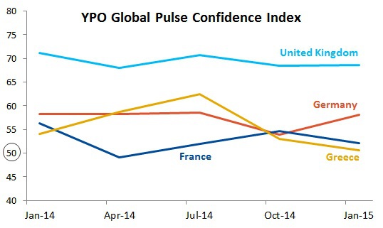 Globally, confidence increases in net oil-importing economies largely compensated for the weakened optimism in oil exporters, leaving the YPO Global Pulse Confidence Index only 0.7 point off its October 2014 reading at a still-optimistic 62.5. Canada was the biggest mover, losing nearly 7 points to land at 59.0, its lowest level since July 2013. The United States, by contrast, edged up 0.8 point to 65.0, the highest reading among the nine regions tracked by the survey. Asia slipped 3.3 points to 62.2, its lowest level in over a year, on the back of tapering growth in China. Non-EU Europe registered the world’s lowest reading at 54.3, weighed down by Russia, whose index plunged to the dismal 30s.
